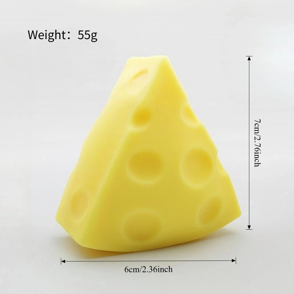 Shaped like a triangular wedge of cheese, this squishy features rounded edges, a smooth surface, and a vibrant yellow color that makes it instantly recognizable — and irresistibly cute. Some versions may even include playful "holes" reminiscent of Swiss cheese, adding to its charm and making it a fun sensory object to look at and hold.